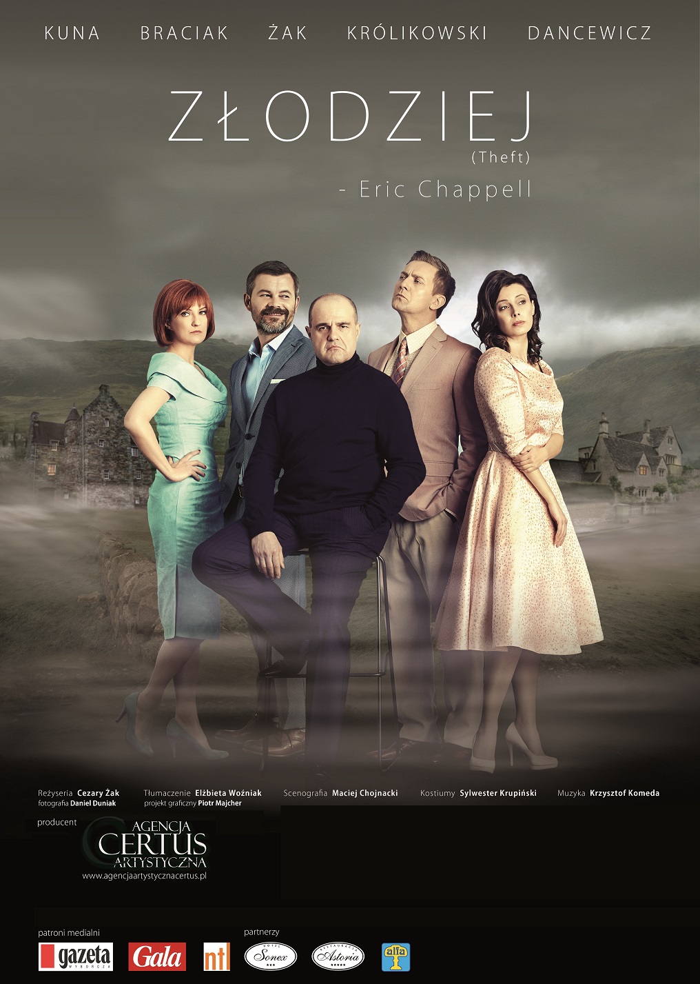 Opis: Sprawa jest bardzo mocno podejrzana. Cezary Żak wpada w prawdziwe opały. Przyłapany na gorącym uczynku musi tak zwieść wszystkich domowników; Renatę Dancewicz, Izabelę Kunę Rafała Królikowskiego i Jacka Braciaka, by ci uwierzyli mu, że choć przebywa w obcym domu, wcale nie jest złodziejem. Trudne zadanie? To się dopiero okaże. Zwłaszcza, że przeszukując dom poznał najgłębsze tajemnice mieszkańców. Złodziej z fantazją – psycholog, który wywróci wzajemne relacje mieszkańców do góry nogami. A całe to zamieszanie ma na dodatek wielce nieprzewidywalne zakończenie. Tak z grubsza da się określić punkt wyjścia historii, którą opowiada Eric Chappell w sztuce „Złodziej”. Autor ten zaliczany jest do grona najlepszych angielskich pisarzy komediowych. Powodzeniem cieszą się nie tylko jego sztuki teatralne. ale także scenariusze filmów i seriali. Sztuka „Złodziej” tak przypadła do gustu Cezaremu Żakowi, że nie mógł sobie i przy okazji widzom odmówić wyreżyserowania jej i zagrania tytułowej roli. Czy dorównał, w głównej roli złodzieja Spriggsa legendzie polskiej sceny – Janowi Kobuszewskiemu (rola Spriggsa 2001 r)? Najlepiej przekonać się o tym osobiście, wybierając się na spektakl. Bowiem „Złodziej” to doskonała gra aktorska, wyśmienita zabawa, błyskotliwe żarty przeplatane brawurowymi zwrotami akcji, a na koniec – zaskakujący finał.